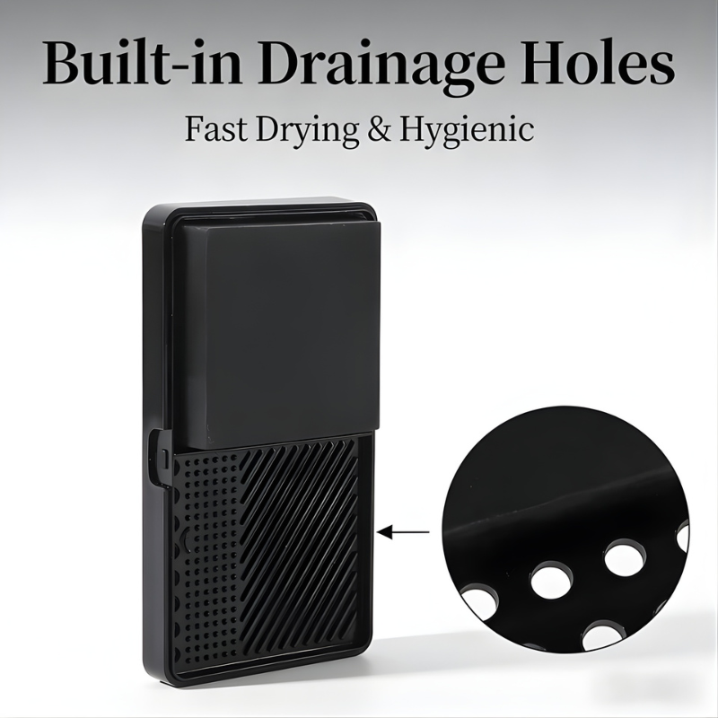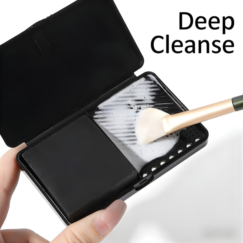 The built-in cleaning pad features multiple textured zones that accommodate various brush sizes. From large powder brushes to small detail brushes, the surface pattern helps sweep away trapped product while maintaining brush shape. The solid soap formula works effectively with water to create a gentle lather that rinses away easily.